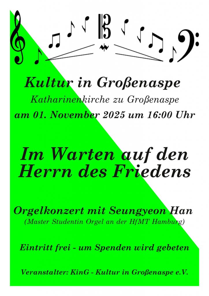 Nach dem sehr gut besuchten Konzert mit Schlagern und Chansons der 20er und 30er Jahre des letzten Jahrhunderts im Kulturraum der Gemeinde  Großenaspe, gibt es nun als letztes Konzert dieser Saison 2025 von KinG – Kultur in Großenaspe e.V. noch ein Orgelkonzert an der historischen Marcussen-Orgel von 1880 mit der jungen koreanischen Organistin Seungyong Han. Dazu laden wir Sie alle herzlich ein am Samstag den 01.11.2025 um 16:00 Uhr
