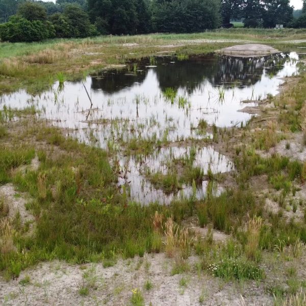 2021/2021 – 3.600 qm Wasserfläche mit 500 qm Böschungsfläche (insgesamt fielen rd. 4.500 qm Bodenaushub an!), 1.800 qm Neuanlage Feldgehölz, Wildschutzzaun (435 lfdm) und Bepflanzung und eines Abschirmwalls (315 Stck. heimische Wildgehölze), 50 lfdm Knickbepflanzung